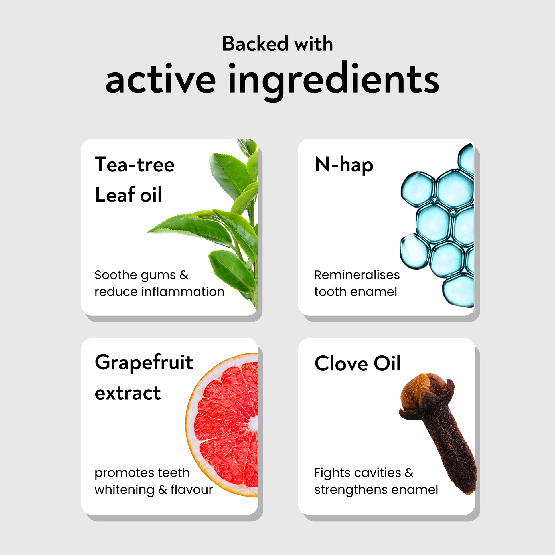 Habbits Te-Cha toothpaste is naturally derived, fluoride-free, vegan, and devoid of titanium dioxide, triclosan, artificial sweeteners or flavours, parabens, microbeads, and SLS. It is loaded with naturally-derived ingredients like Activated Charcoal, Tea Tree Oil, and Spearmint as the core ingredients. This mixture safeguards gums, naturally whitens teeth and freshens breath. It prevents cavities, is fully safe for enamel, and is appropriate for daily usage.