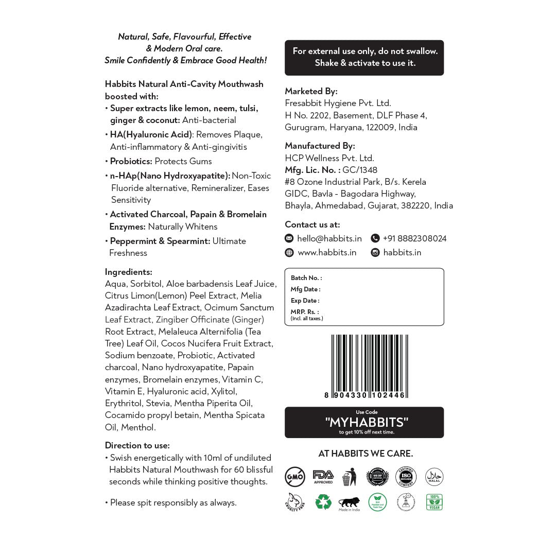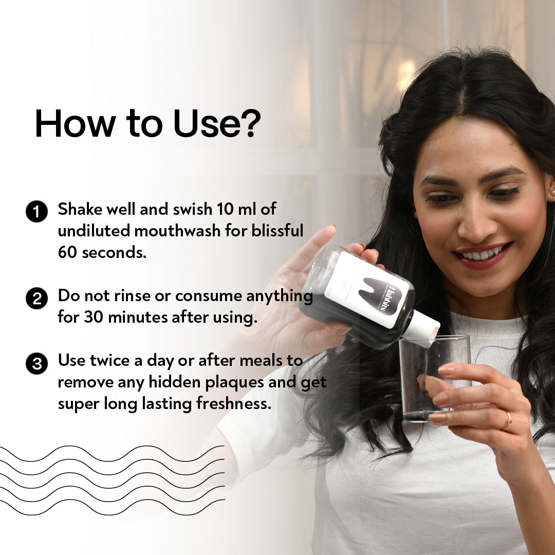 To use Habbits Teeth-Whitening Charcoal Mouthwash, simply swish 10 ml of undiluted mouthwash in your mouth for 30 seconds, then spit it out. Use it twice a day, after brushing your teeth, and after meals.