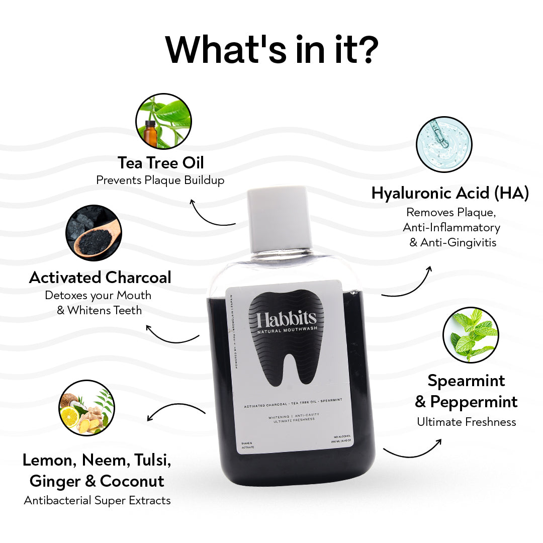 Habbits Teeth-Whitening Charcoal Mouthwash is a natural mouthwash that helps to whiten teeth, freshen breath, and protect against cavities and plaque buildup.