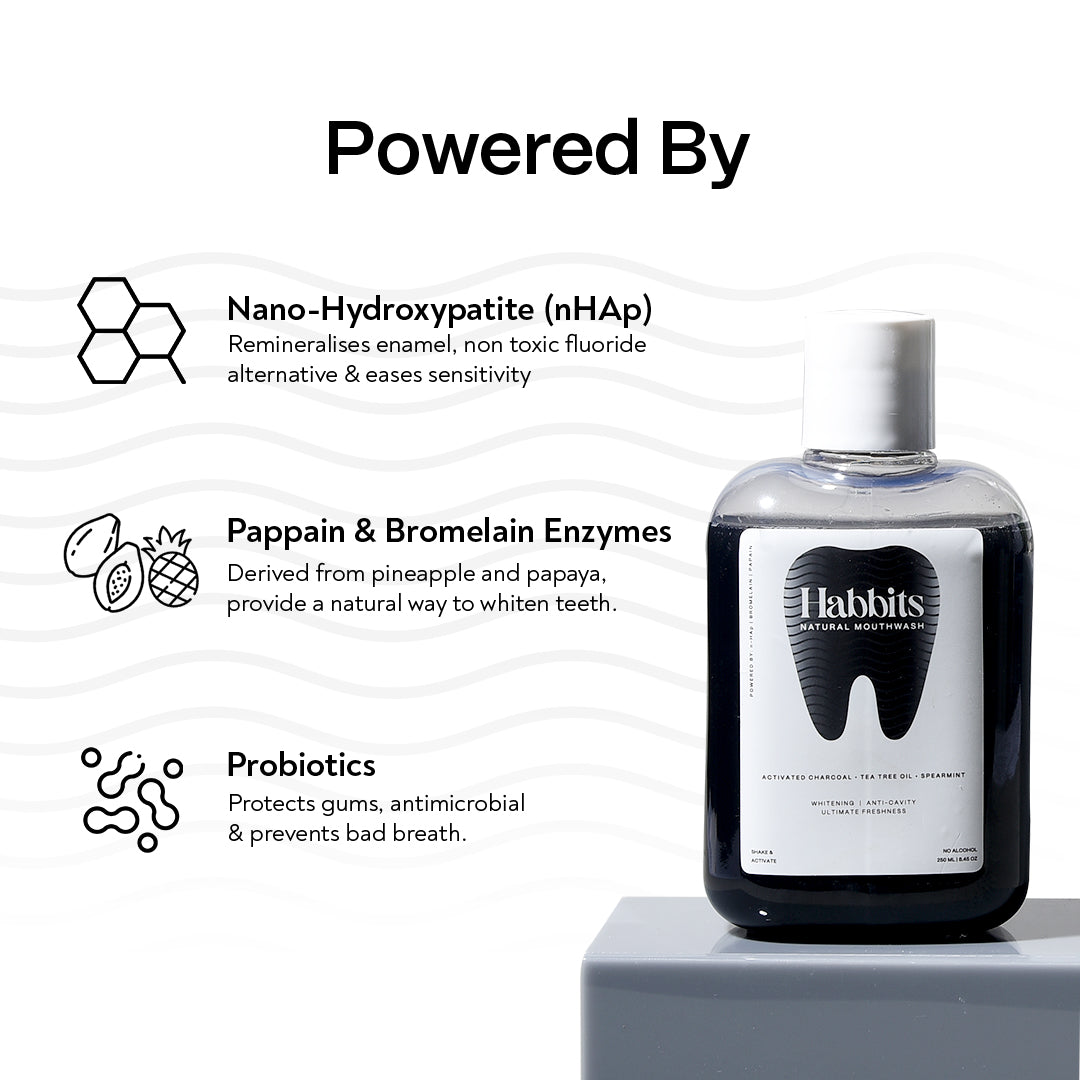 Habbits Teeth-Whitening Charcoal Mouthwash works by using a combination of natural ingredients to remove stains, whiten teeth, and protect against cavities and plaque buildup. The activated charcoal, papain, and bromelain enzymes work to break down and remove surface stains, while the hyaluronic acid, nano-hydroxyapatite, and probiotics help to strengthen tooth enamel and promote healthy teeth and gums.
